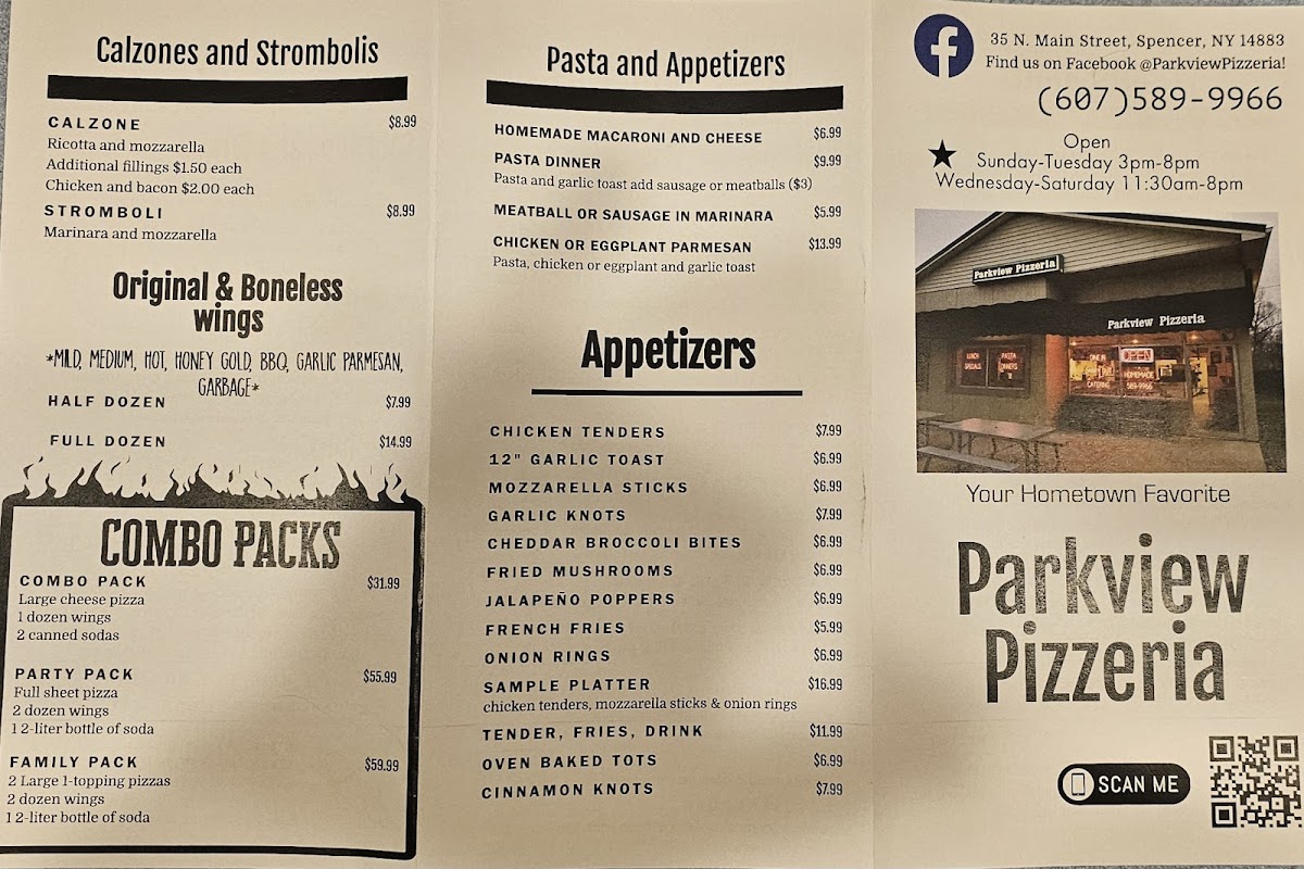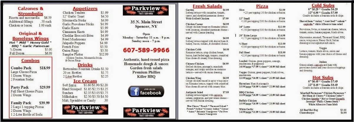 Parkview Pizzeria, located on North Main Street in Spencer, New York, is a welcoming neighborhood spot known for classic pizzeria favorites and comforting Italian-American dishes. The menu offers a wide variety of options, from hand-tossed pizzas and baked pasta to hot subs, fresh salads, and shareable appetizers. A selection of soft drinks and casual beverages complements the food, making it easy to enjoy a quick bite or a relaxed meal with family and friends.